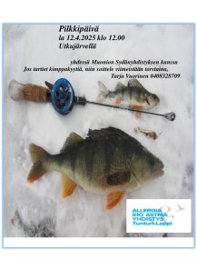 Pilkkipäivä Utkujärvellä la 12.4 klo 12.00 yhdessä oloa pilkkien ja kahvistellen. Ilmoita osallistumisesi tai jos tarvitset kimppakyytiä soittele Tarjalle 0408328709 viimeistään 10.4 mennessä. Tunturi-Lapin Allergia-, Iho- ja Astma yhdistys ja Muonion Sydänyhdistys toivottaa jäsenet ja muut kiinnostuneet tervetulleiksi mukaan.