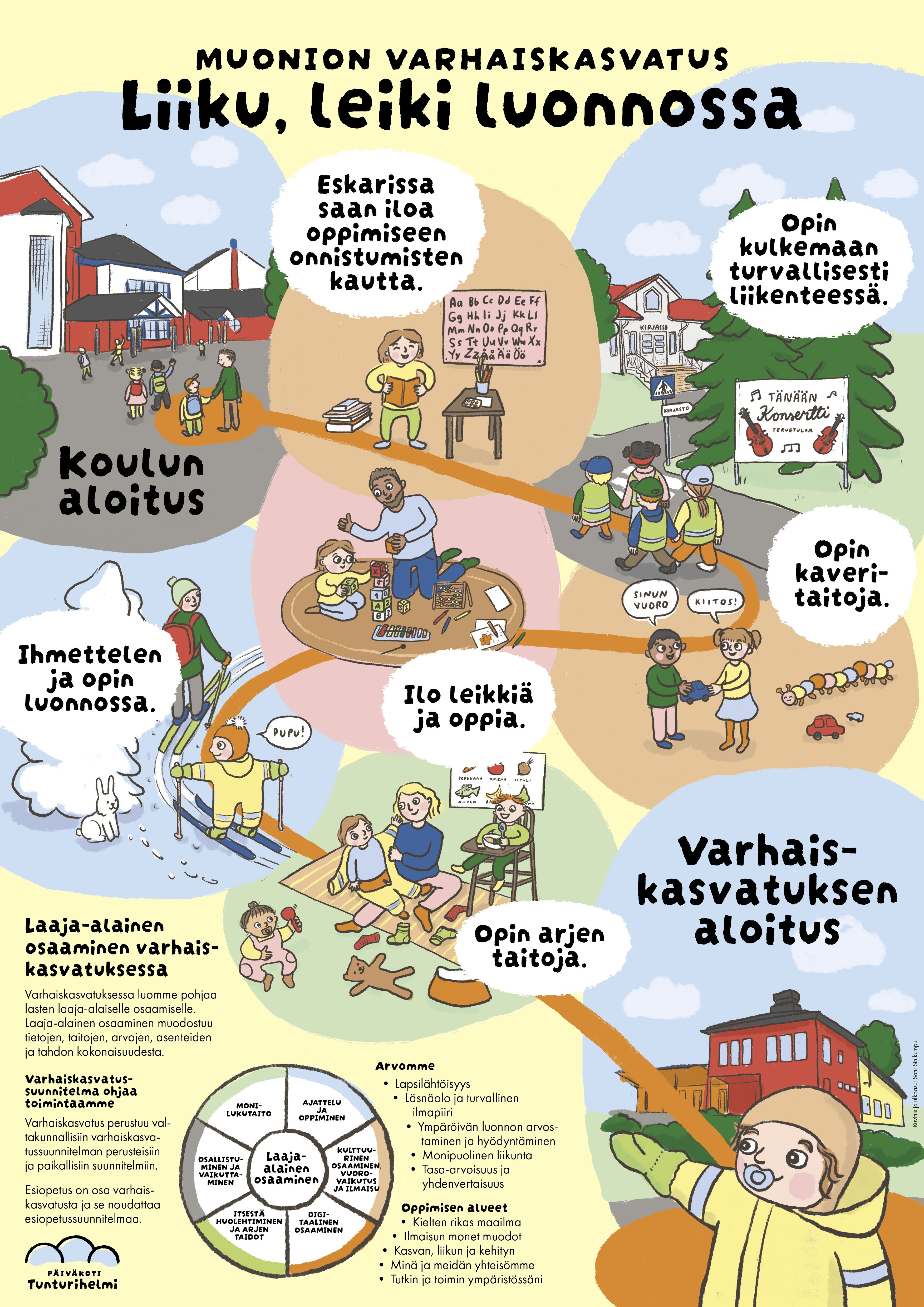 Arjen toiminnassamme on vahvasti läsnä ympäröivä luontomme. Ulkoilemme ja liikumme runsaasti sekä hyödynnämme luontoa oppimisympäristönä.
