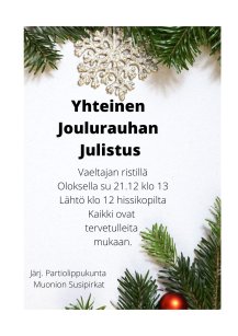 Partiolaisten järjestämä joulurauhan julistus Vaeltajanristillä su 21.12. klo 13. Yhteislähtö klo 12 Oloksen hissikopilta. Mukaan voi ottaa liukurit, pulkan tms. paluumatkan mäenlaskua varten. Tied. 0504006456/Taija