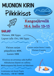 Muonion Kiri järjestää pilkkikisat Kangosjärvellä 18.4. klo.13-15. Sarjat: yleinen 20€, lapset 10 €. Kisoissa on arvontaa sekä puffet! Akkukairan käyttö on sallittua. Maksutapana käy kortti tai käteinen.