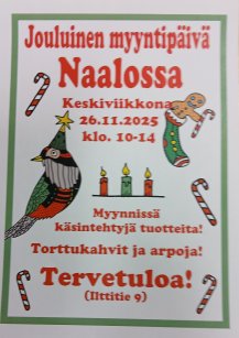 Ke 26.11.2025 klo 10-14. myymme käsintehtyjä tuotteita, torttukahvit ja arpoja. Tervetuloa tervehtimään meitä Toimintakeskus Naaloon.