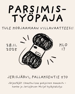 Tule opettelemaan erilaisia parsimistekniikoita ja korjaamaan samalla villavaatteesi! Paikalla glögitarjoilu ja hyvää seuraa. Aika: Perjantai 28.11.2025 klo 17-19 Paikka: Jerisjärvi, Törmäslompolon maatilamatkailun olohuone, osoite Pallaksentie 570. Järjestäjät: Ilmastoviisas pohjoinen maaseutu -hanke ja Jerisjärven Muijat kyläyhdistys. Työpaja on EU:n osarahoittama.