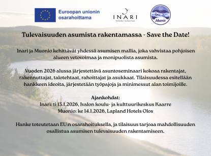 Asuntoseminaari järjestetään Inarissa tiistaina 13.1.2026 ja Muoniossa keskiviikkona 14.1.2026. Hankkeen aiemmissa vaiheissa on toteutettu verkkokysely ja asukastyöpaja.