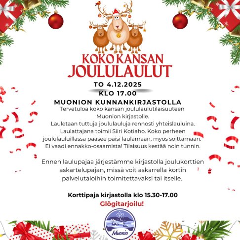 Ennen laulupajaa järjestämme kirjastolla joulukorttien askartelupajan, missä voit askarrella kortin palvelutaloihin toimitettavaksi tai itselle.
