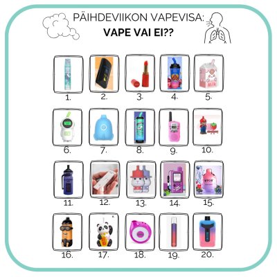 Suomessa vietetään vuosittain viikolla 45 ehkäisevän päihdetyön viikkoa. Viikko on Ehyt Ry:n organisoima. Muonion nuorisopalvelut järjestää vuosittain valtakunnallisella ehkäisevän päihdetyön viikolla ohjelmaa sekä perusopetukseen että toisen asteen oppilaitoksiin yhteistyössä eri toimijoiden kanssa. Vuonna 2024 teemana oli sähkötupakointi eli vapetus sekä nikotiinipussit. Etenkin sähkötupakointi eli vapetus on ilmiönä kasvanut kovasti ja se on levinnyt entistä nuorempien, jopa lasten keskuuteen. Tupakkateollisuus tekee kaikkensa, että uudet käyttäjät saataisiin riippuvaisiksi mahdollisimman varhaisessa vaiheessa. Siksi vapet eli sähkötupakat näyttävätkin entistä enemmän leluilta. Tunnistatko sie mikä näistä kuvista on vape? Vinkkina: Vain kaksi EI ole, kaikki muut ovat. Sähkötupakointi vahingoittaa keuhkoja merkittävästi nopeampaa kun perinteinen tupakointi.